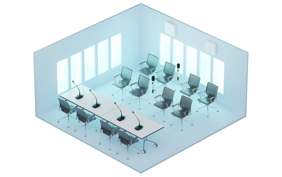 A good example is the classic lecture hall scenario. Different people give presentations all day long in the same lecture hall. While one person likes to talk with a hand microphone, another person prefers to use a headset. A SL MCR 2 DW, the 2-channel version of the SpeechLine Multi-Channel Receiver, is mounted on the wall. The hand microphone is connected to the first channel and the bodypack transmitter for the headset is connected to the second. The Multi-Channel Receiver is connected to the loudspeaker system of the lecture hall via Dante. Thanks to the combination of the equalizer integrated per channel in the Multi-Channel Receiver with the automatic Audio Level Management and the Automixer integrated in the Multi-Channel Receiver, no additional DSP or mixer is needed.