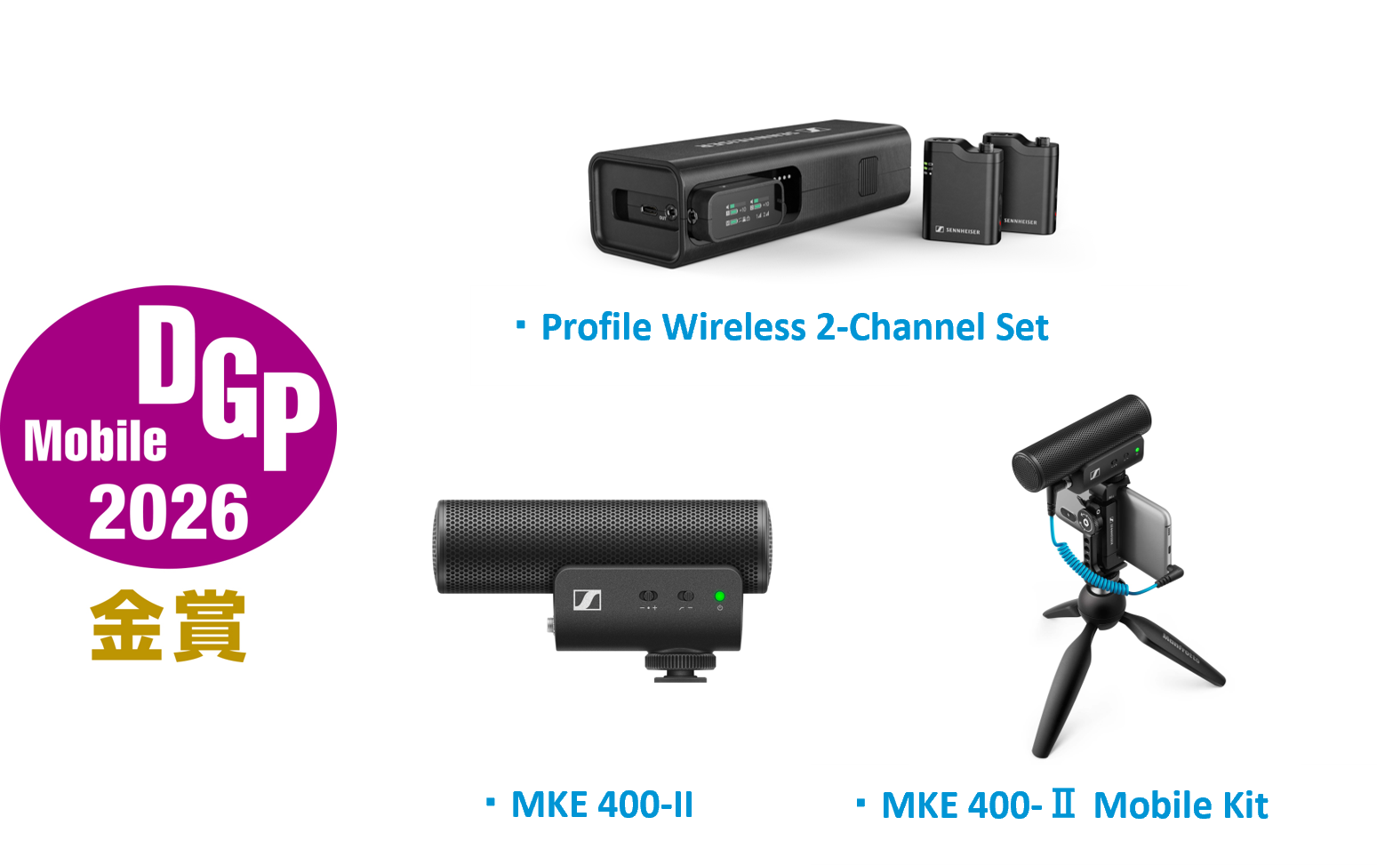 ゼンハイザージャパン株式会社(代表取締役:宮脇 精一、以下「当社」)の外付けマイクおよびワイヤレスマイクシステム計3製品が、DGP実行委員会(株式会社音元出版内)主催の「DGP モバイルアワード 2026」を受賞しました。「Profile Wireless 2-Channel Set」はワイヤレスマイク<プレミアム>部門、「MKE 400-II」は外付けマイク<モバイルタイプ>部門、「MKE 400-II Mobile Kit」はVlogキット部門にてそれぞれ最も優れた製品に贈られる金賞を受賞しました。「MKE 400-Ⅱ」、「MKE 400-II Mobile Kit」は各部門にて3年連続の金賞受賞となります。