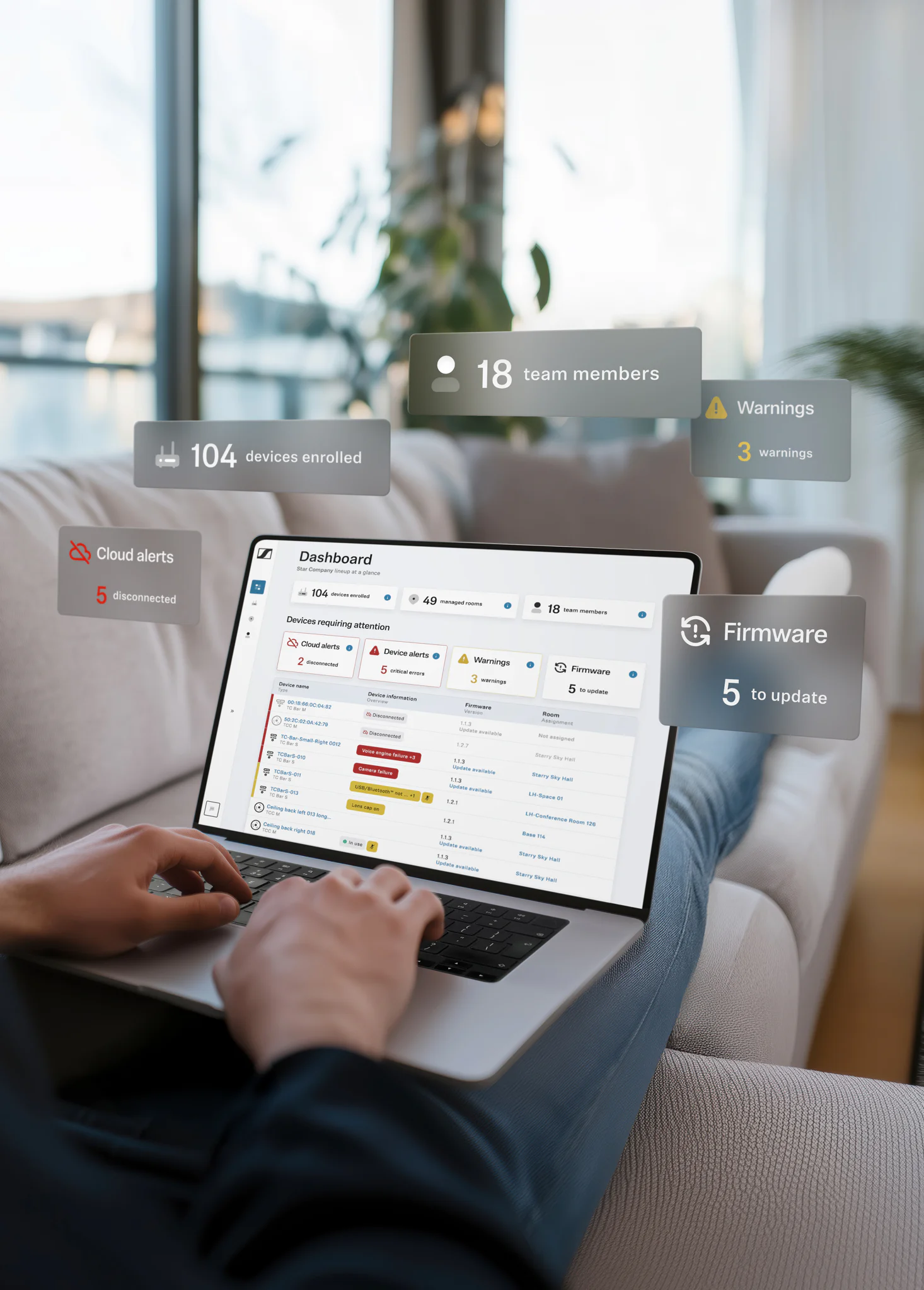 「DeviceHub」は、ネットワーク接続されたゼンハイザーデバイスを、あらゆるブラウザから管理可能にするクラウドプラットフォームです。リアルタイムモニタリング、診断、アラートにより、デバイスの状態やパフォーマンスを明確に把握でき、会議や授業でのトラブルを防ぎます。また、オフライン・オンラインを問わず、迅速な対応が可能です。