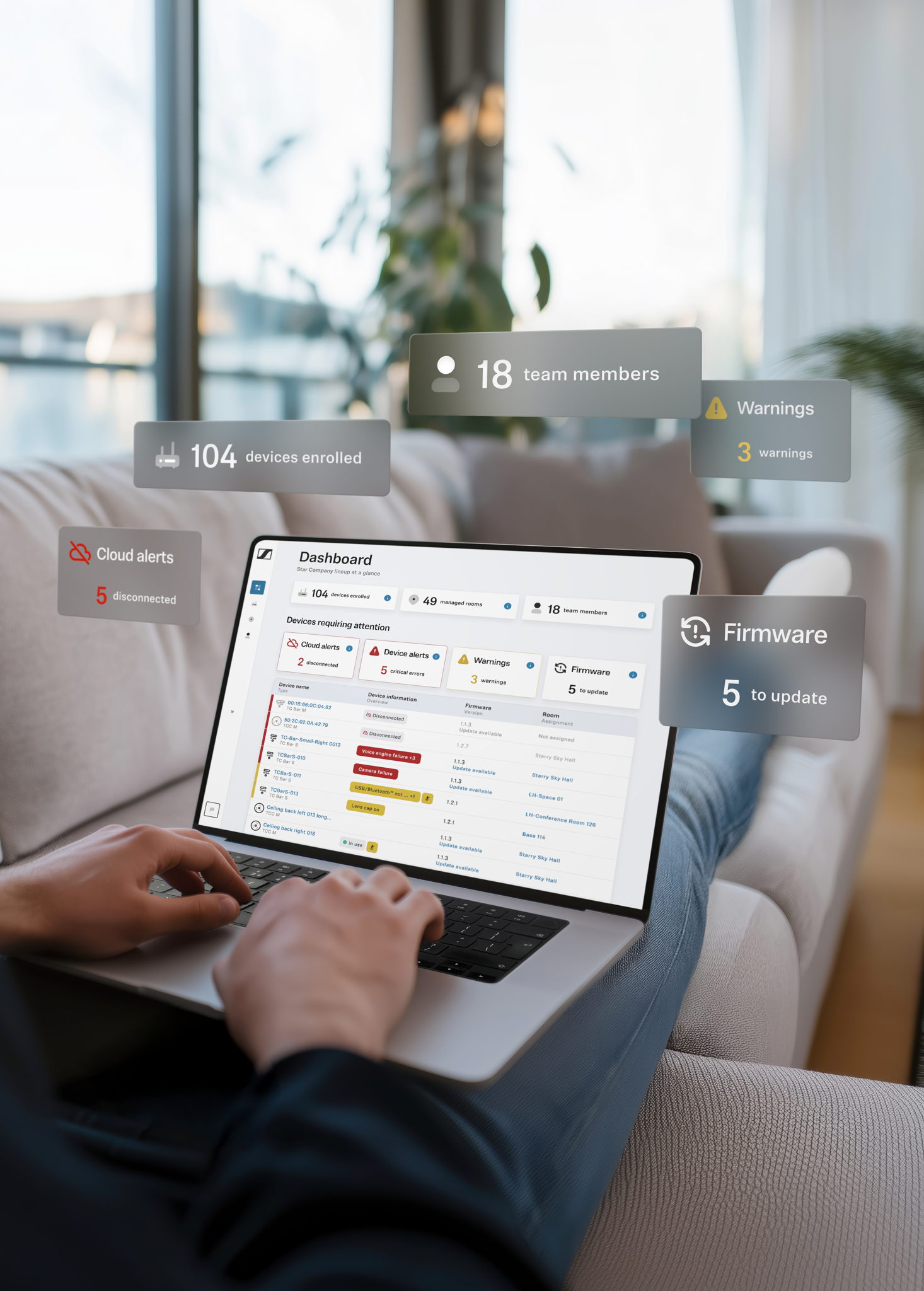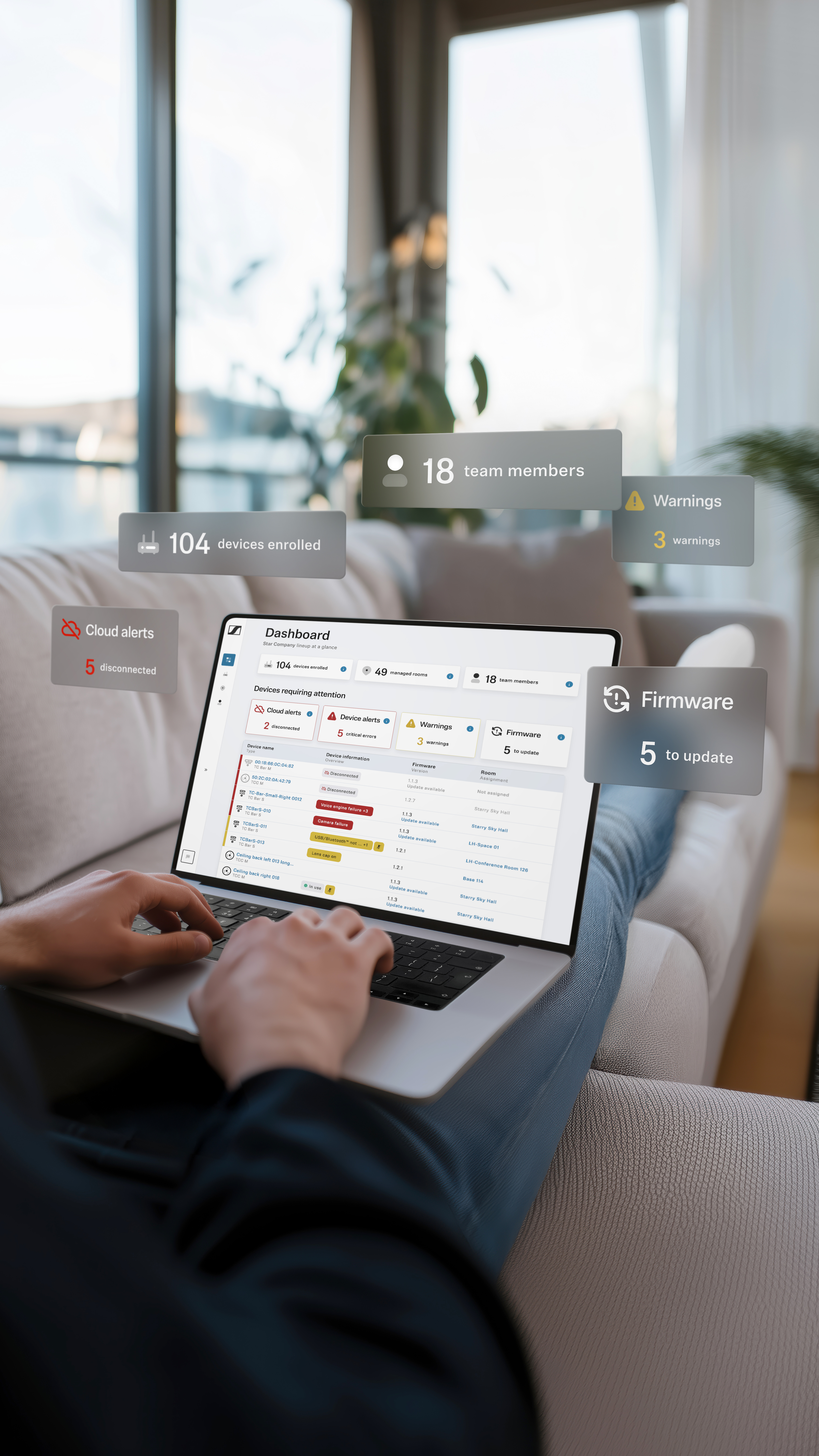 For IT personnel, DeviceHub simplifies management at scale by organizing devices by room, building, campus, or region in a structure that mirrors real-world environments. This provides a clear view of every space from a single platform, allowing teams to navigate between locations easily, view devices in context, and understand system health at a glance, from a handful of rooms to global estates.