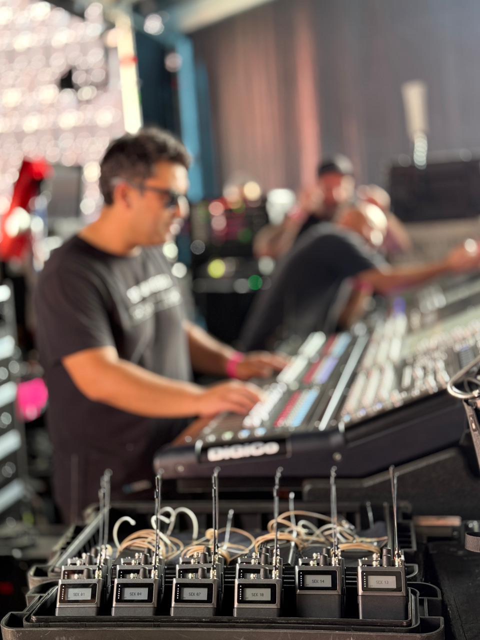 El despliegue contempló diversos componentes. En el Teatro Teletón se utilizó Spectera con 18 bodpacks bidireccionales SEK con micrófonos Headmic 4 y antenas DAD, 24 canales de EW-DX con micrófonos de mano EW-DX SKM (cápsulas MMD 935 y MM 445), antenas A 5000-CP y ADP UHF, además del sistema Digital 6000 con dos micrófonos de mano SKM 6000 (cápsulas MMD 935). Para el monitoreo in-ear se dispusieron 16 canales de la Serie 2000 IEM con 32 bodypacks EK 2000 IEM, todo coordinado mediante el software SoundBase para una gestión precisa del espectro. En el Estadio Nacional se replicó la estrategia con un segundo sistema Spectera como núcleo, reforzado con 20 bodypacks bidireccionales SEK, 4 Headmic 4, 8 canales D6000, 16 canales EW-DX y un set IEM de 16 transmisores SR 2050 y 24 receptores bodypacks EK 2000, acompañados de múltiples antenas de soporte.