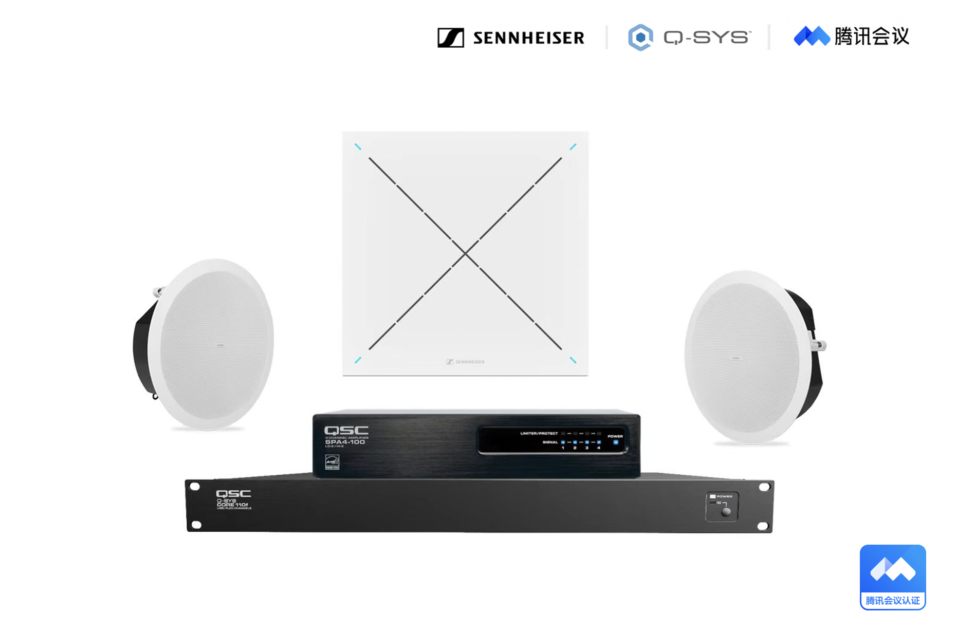 The certified Sennheiser and Tencent Meeting communications system solutions include TCC2, Q-SYS Core 110f, SPA Series amplifier, and an AcousticDesign Series loudspeaker. The partnership between Sennheiser and Tencent Meeting delivers a seamless, high-quality complete audio experience for hybrid office scenarios.