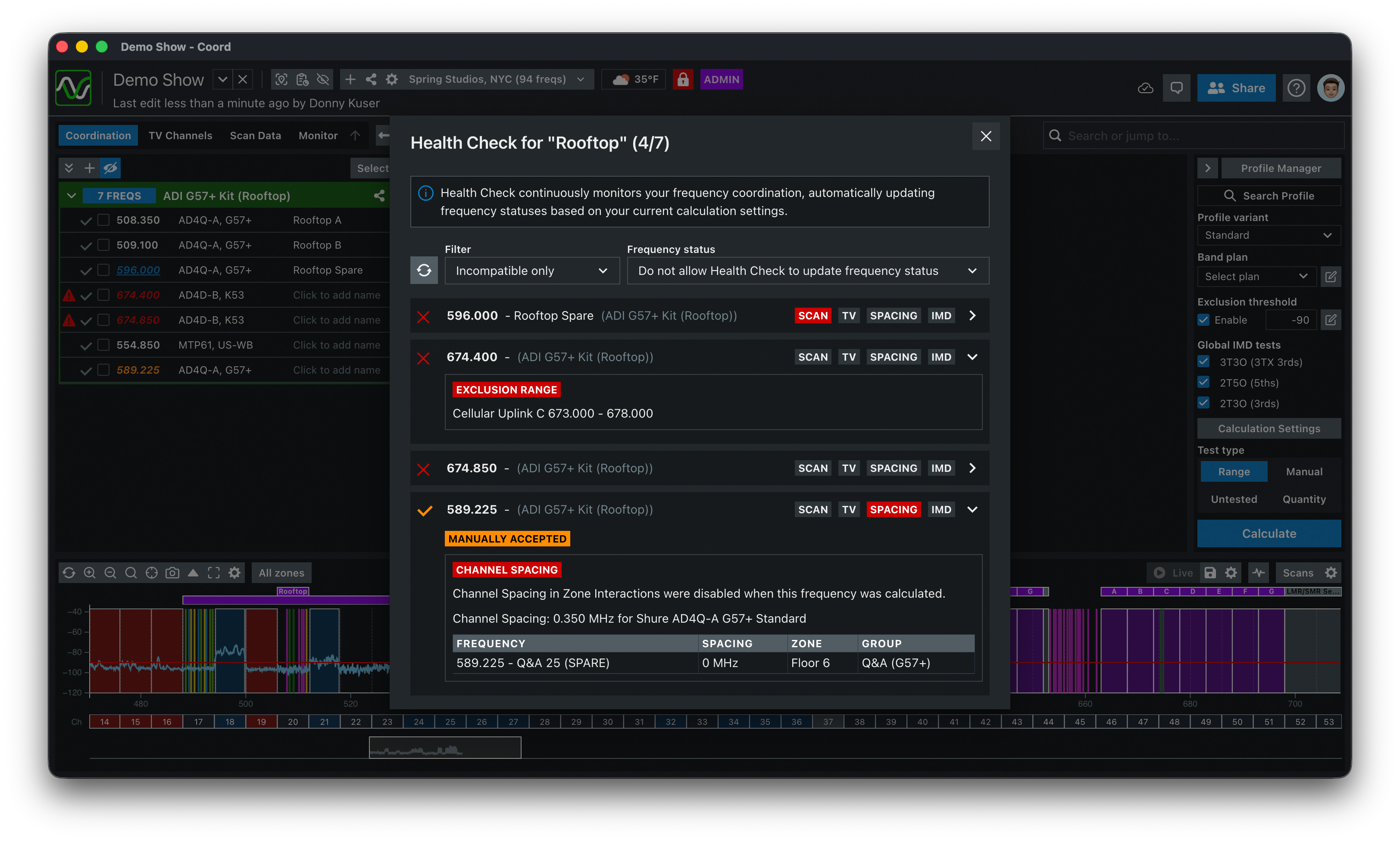 SoundBase’s Health Check has become an important feature for both broadcasters and live sound specialists. “During large productions, and especially during big music festivals with multiple stages, the most perfect frequency plan can suddenly become obsolete and has you frantically searching for solutions,” says Matt Dale, co-founder of SoundBase. “That’s why we developed the Health Check function, and it’s very rewarding to see that engineers absolutely love it.”