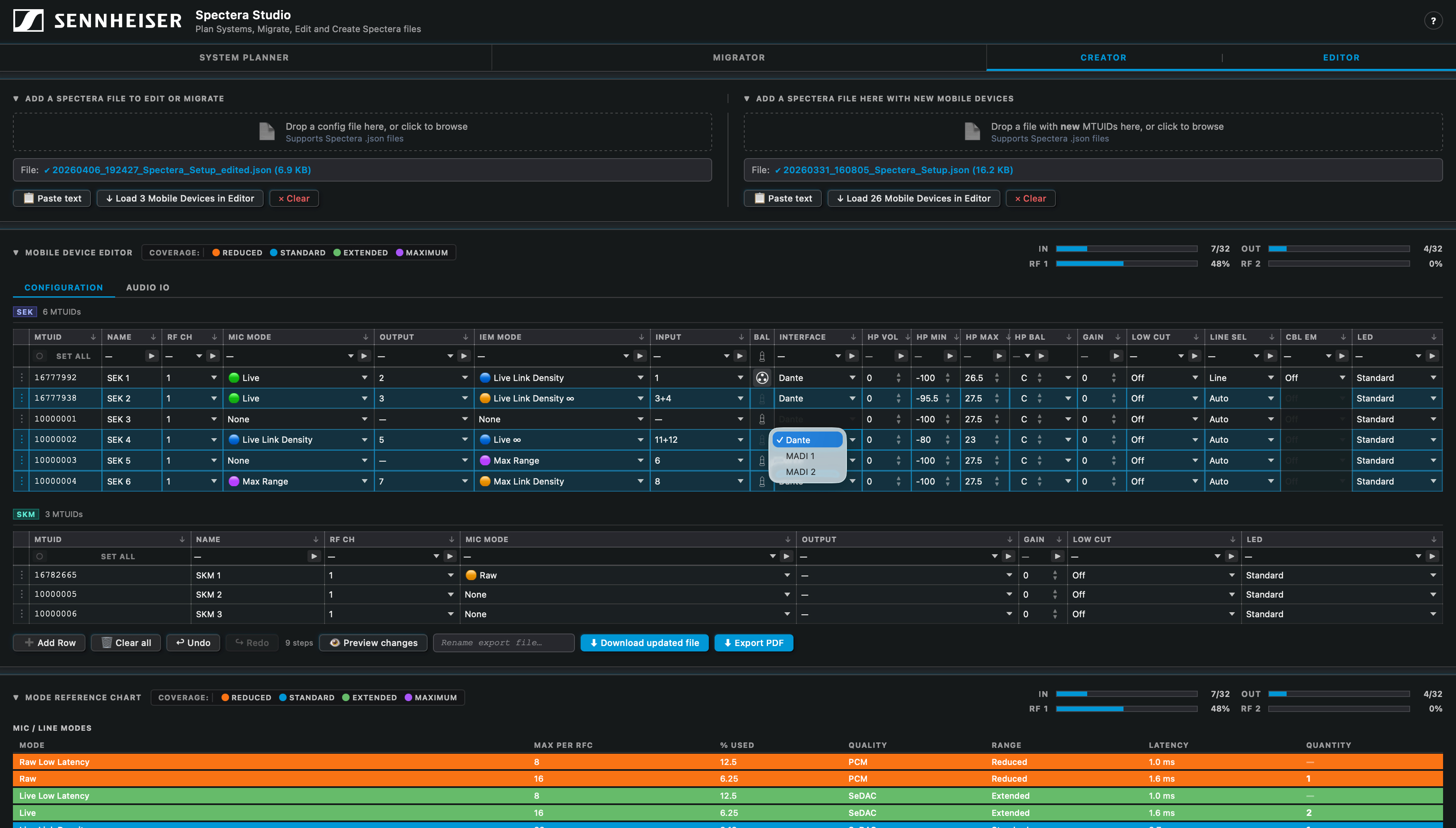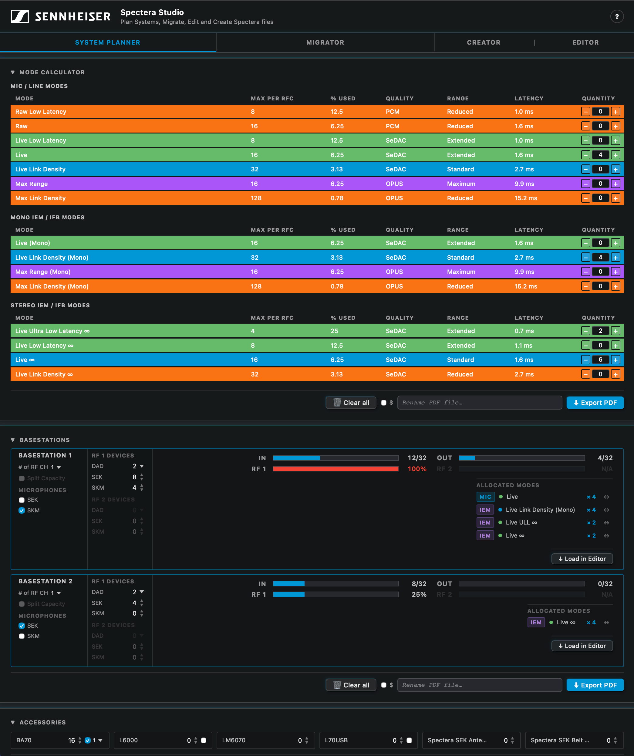 Beyond configuration management, Spectera Studio functions as a comprehensive system planner. Within the planner interface, link modes, mobile devices, and antenna configurations per RF channel can be specified. Based on these inputs, Spectera Studio calculates RF capacity usage and determines the number of Base Stations required for the set-up. Users are able to specify accessories and can download a system overview in pdf format for planning and documentation purposes or for sharing. Planned Base Station configurations can be loaded directly into the editor to begin building system files for deployment.